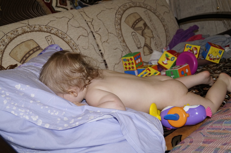 Распорядок дня остаётся тем же. Сон 2 разовый. Но ночь теперь не укачиваемся. Ложусь сама и она ложится рядом. Берёт бутылку пьёт то молоко, то воду попеременно. Поползает по дивана. Поковыряет мне глаза. Повозится и засыпает. Спим вместе.