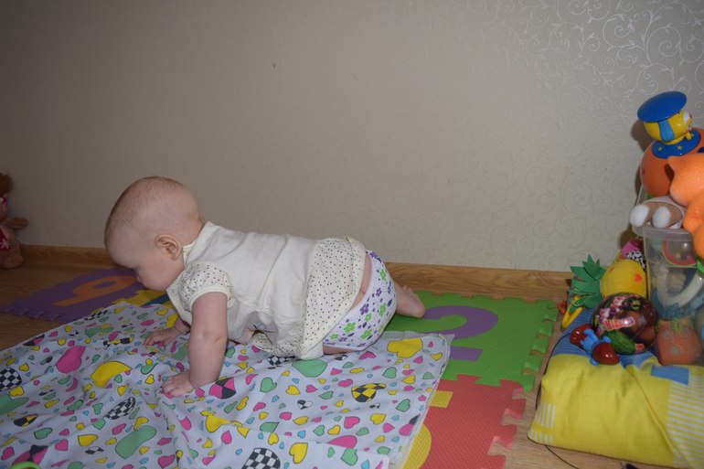У нас так же) на месте крутится без проблем, а вот ползти вдаль пока не получается. Пробовали отодвинуть игрушку чуть-чуть, она конечно покряхтит, но доползет, а вот если отодвинуть далеко, то она даже стараться не будет, возьмёт что поближе)