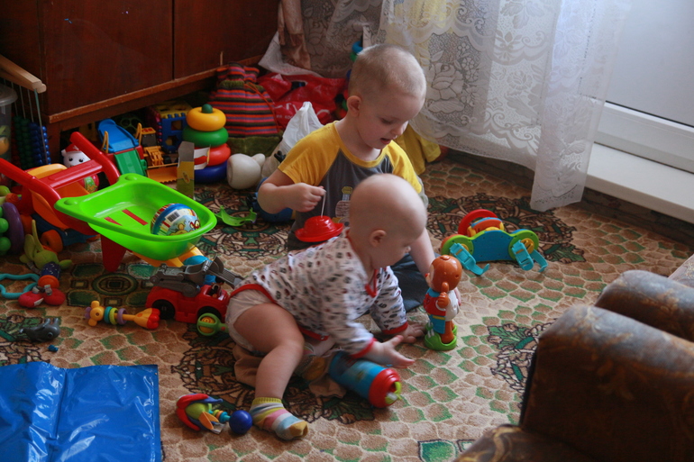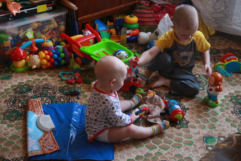 С братом у них огромная любовь)) не могут и часа прожить без обнимашек)) очень любит с братом поиграть) Данюша делется с ним игрушками, но бывает когда очень увлечен игрой может и отодвинуть..но аккуратно...