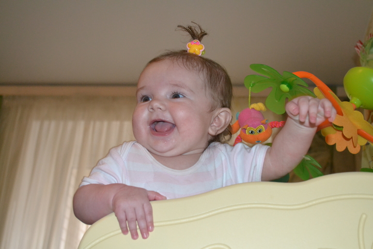 Днем 3-4 раза от получаса до 2 часов спит. Кушаем смесь по 120-180. С утра яблочное пюре, в обед пытаемся есть овощи, но цветная капуста и брокколи дали высыпания(, так что продолжаем экспериментировать, вечером овсяная кашка с яблоком, вроде неплохо пошла. До этого ели гречневую безмолочную- боролись за каждую ложку. В 5.5 месяцев начала садится, если есть за что схватиться, в стульчике, в кроватке и т.д. Сидит хорошо, если с рукой держится, если без опоры, то недолго пока, пару минут. В 6 месяцев и 1 день встала в кроватке. Встает на четвереньки, раскачивается, но пока не ползает, только падает вперед) Очень много болтает агу, абу, ма, м, ббб, ааа и другие звуки) Часто улыбается и хохочет) Причем по ей одной понятным причинам)) недавно развеселило крутящееся колесо велотренажера) хохотала до истерики)) В 5.5 сделали вторую акдс (инфанрикс и полиорикс) перенесла плохо, температура в первый день до 38.3 поднималась, 3 раза давала нурофен, на второй день 37-37.5 весь день. Потом, слава богу, все нормально. Зубиков по прежнему пока нет, ждем.Ну вот вроде и все) Растем и радуем маму с папой!
