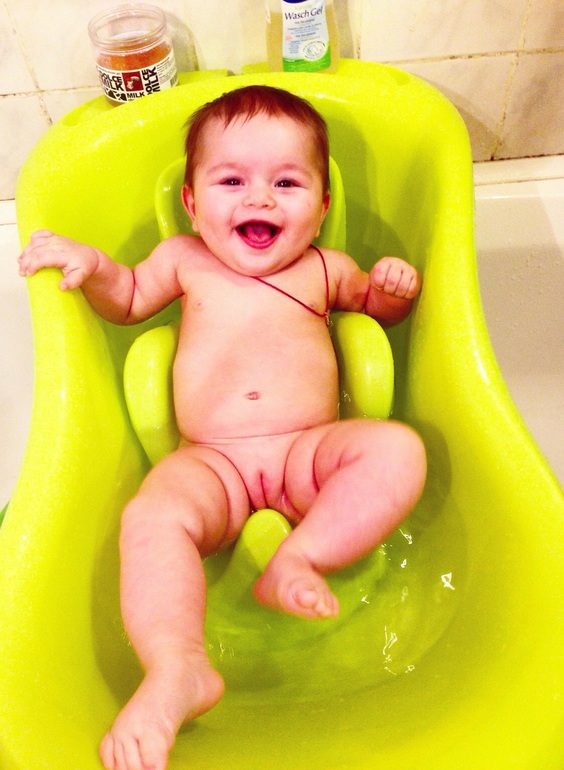 Итого: 6 кормлений в сутки, смена памперса 5-8 раз в день, сон около 12.5-13 часов. Купаемся через день.