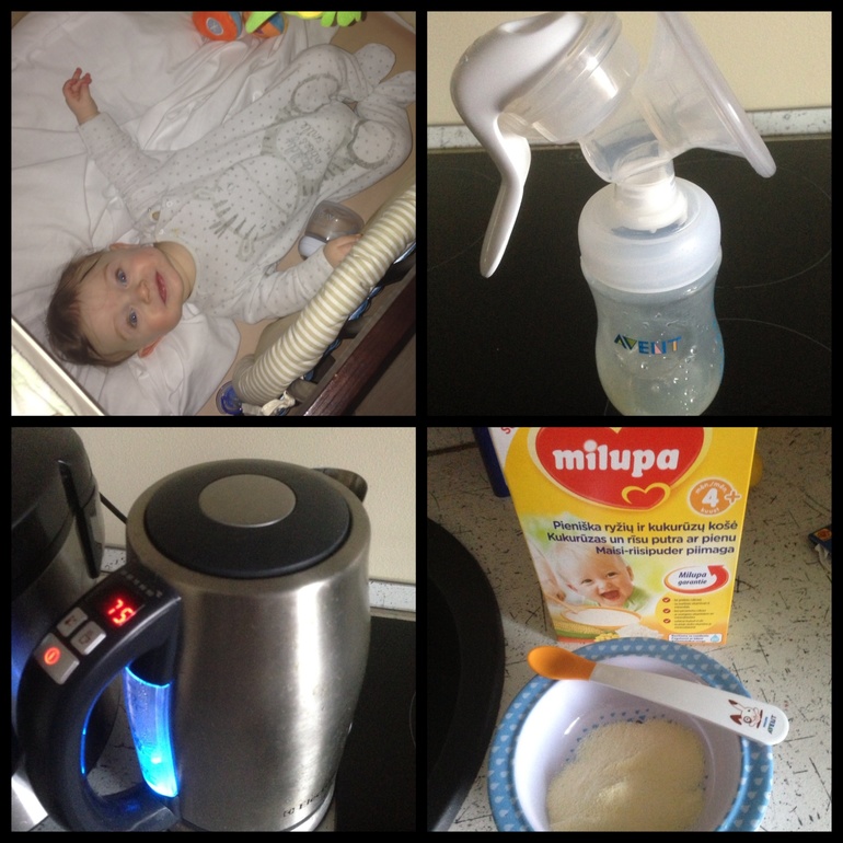 Пока сынок лежит в кроватке и наблюдает за мобилем,я тем временем бегу сцежевать молочко, кипячу водичку для кашки