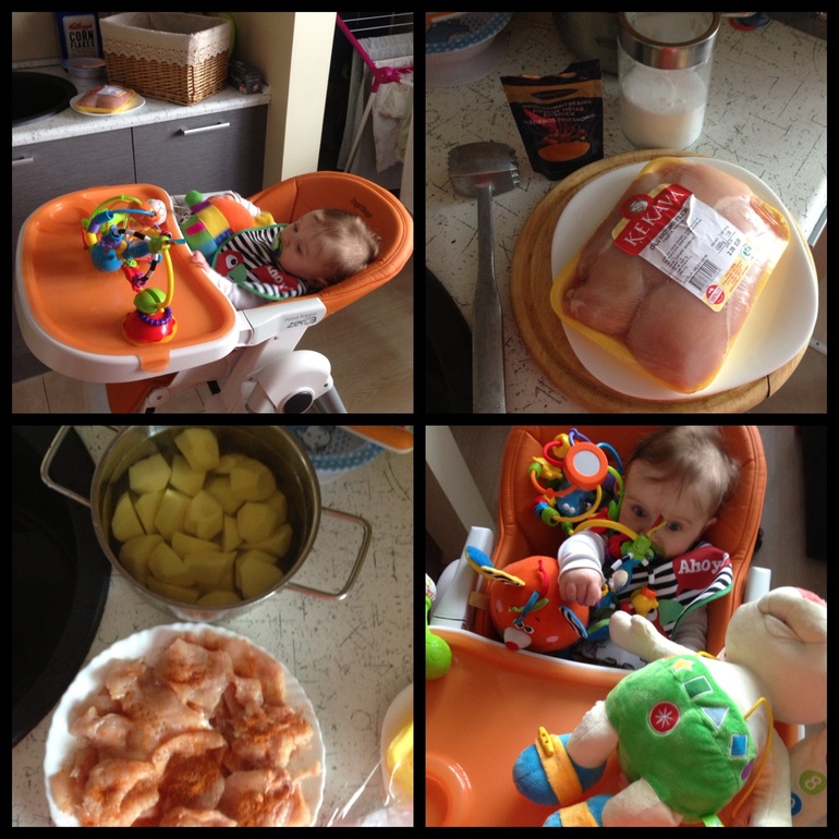 Надо готовить ужин, чищу картошку, подготавливаю куриное филе, Максимка наблюдает за мамой, разговариваю сним и слушаем песни-сказки, которые рассказывает зайка)