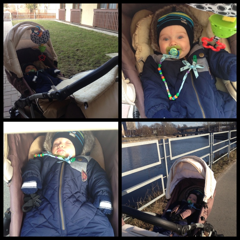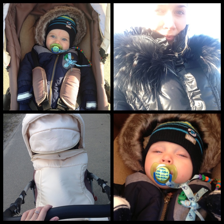 Понимаю что зря запихнула сына в овчиный конверт, на улице весна-погда чудесная) Заношу конверт обратно, идём в весеннем комбезе и ссобой на всякий случай взяли пледик)
