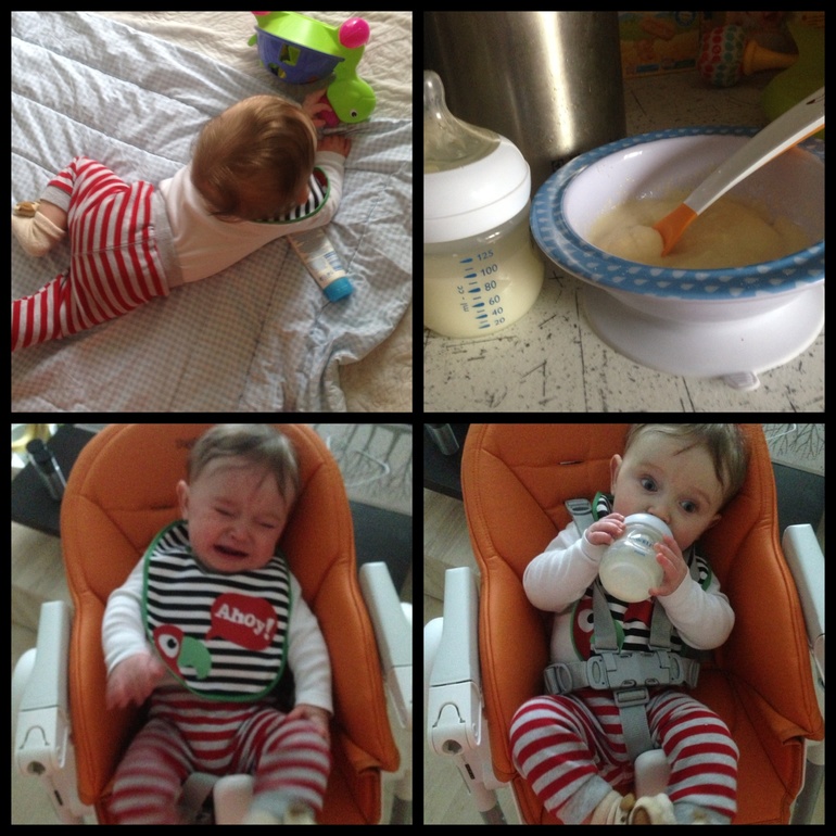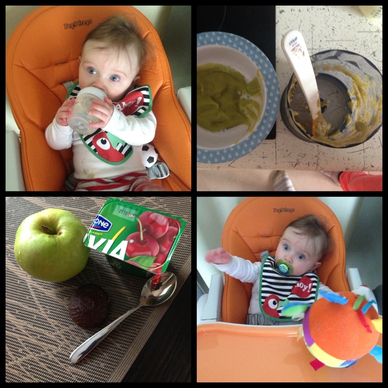 Вот пришли с ванны оделись и сразу же перевернулись на пузо. И вот мы уже завтракаем кашкой( рисовая с кукурузной), и запиваем молочком. максимка всегда начинает плакать, как только оказывается в стульчике, видно уже понимает что должы уже скоро дать покушать)