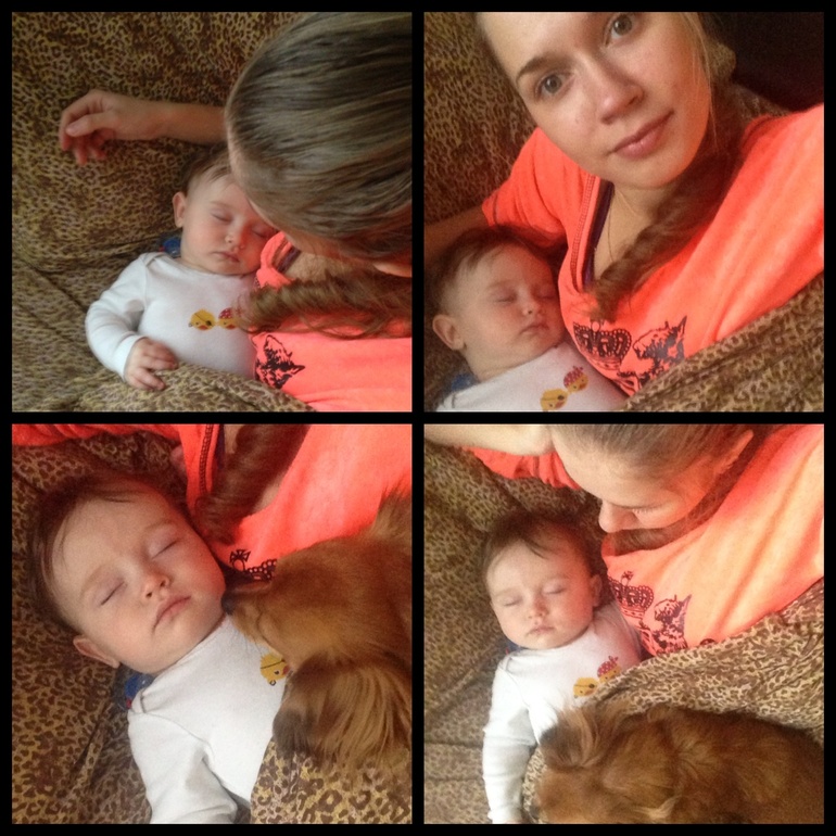 Я охраняю его сон, переодически даю ему соску, и сама дремлю)) К нам приходит пёсик)