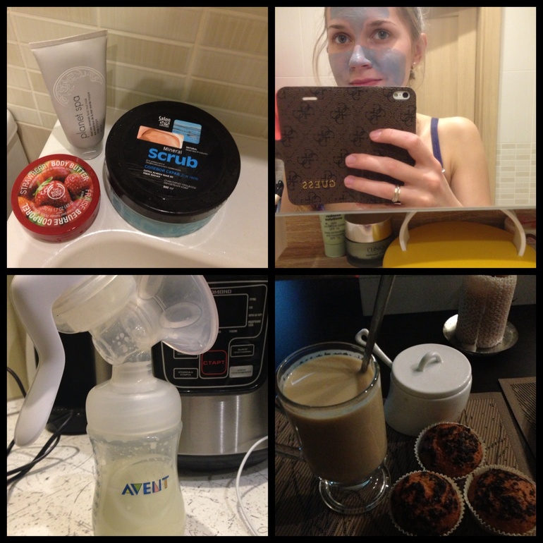 Иду в ванну скрабиться, а на лицо маску)) Сцеживаю молочко, сажусь пить лёгкий кофеёк со сливками и кексики, смотрю "Соблазны", папа наш уже уснул, ну да ладно пусть дрыхнет, завтра же ему опять на работу)