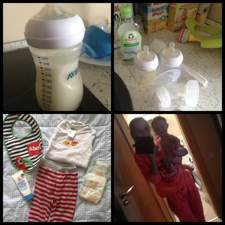 Молочко готово, сынок пока увлечён мобилем, решаю помыть бутылочки, которые накопились за ночь, подготавливаю нам наряд и мы с Максимкой идём в ванну мыть попку и умывать личико))