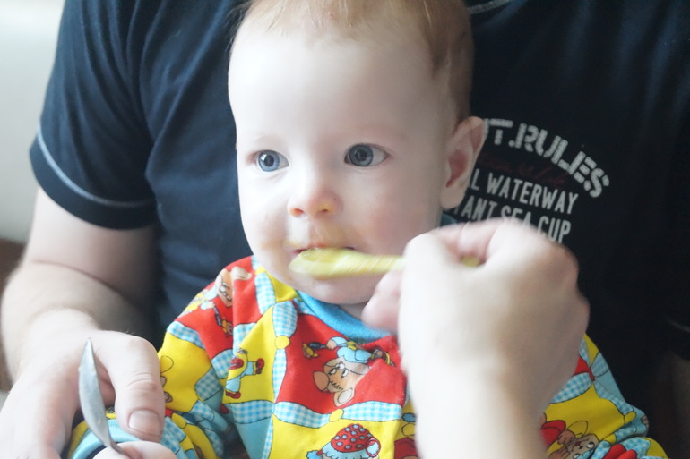 Вводим прикорм понемногу: кабачок, цветная капуста, ( броколли не пошли, позже попробуем), каша гречневая. Кушаем пюре по пол баночки, пару раз чмокнит грудь после и все, наелся, малоежка что ли.