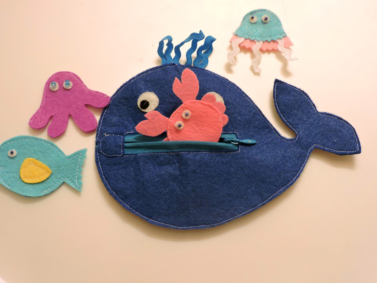 Все морские обитатели - это пальчиковые игрушки, они на липучке с обратной стороны. Можно устроить театральное представление, лепить игрушки прямо в книжке и они будут держаться. Максимке очень понравилось и он с нетерпением ждет продолжения.)