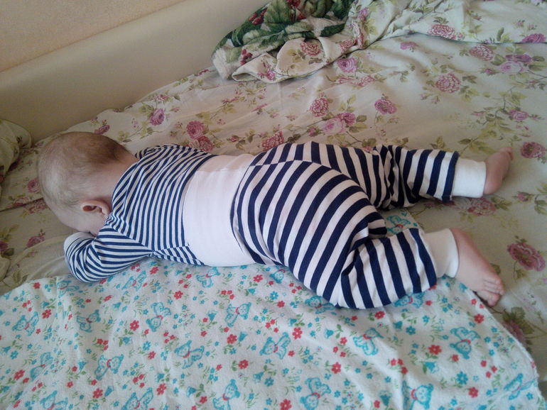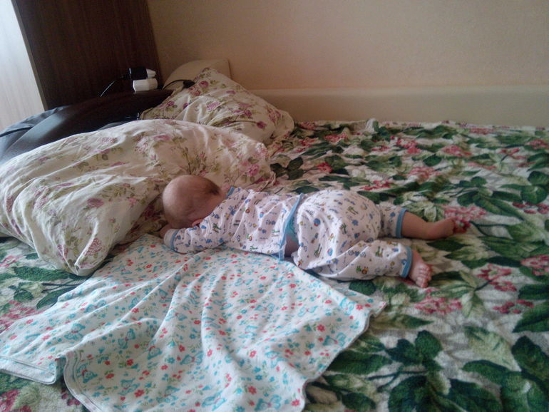 Так как Ромыч научился переворачиваться со спины на живот (правда,пока что только через левый бок,но мы над этим работаем), то спать на спине и боках ему уже не интересно))) Раньше он если просыпался,то уже все,не засыпал дальше сам,нужна была я:) а сейчас проснется,посмотрит все ли вокруг в порядке,переворачивается на живот и дальше спать:) такой смешной:)