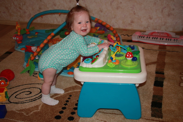 За этот месяц только начали уверенно ползти, вставать на коленки и со вчерашнего дня мы стоим на ножках! :)