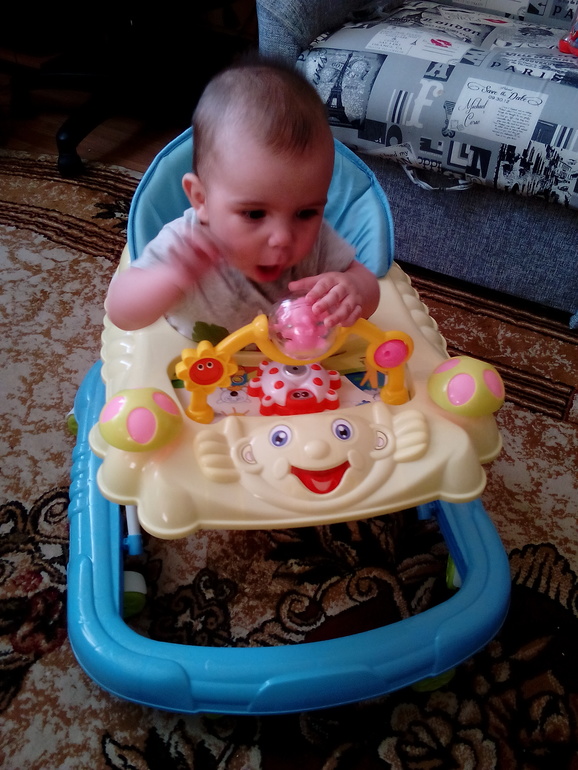 Теперь он встает на ножки у опоры, в кроватке ему просто интересно стоять, играть мы там можем минут 5 не больше.Ходить за ручки мы готовы целыми днями, поэтому мне просто пришлось его поставить в ходунки, как бы я этого не хотела.Иначе мне пришлось бы терпеть даже в туалет до тех пор, пока мой муж не придет с работы))))В ходунках мы освоились быстро, теперь ходит за мной и на кухню, и в туалет и в ванну))))В общем, я хоть что-то стала делать...Думаю, не за горами как он сам пойдет...Уж очень уверенно он стоит.Может отпустить руки и простоять без опоры несколько секунд))))
