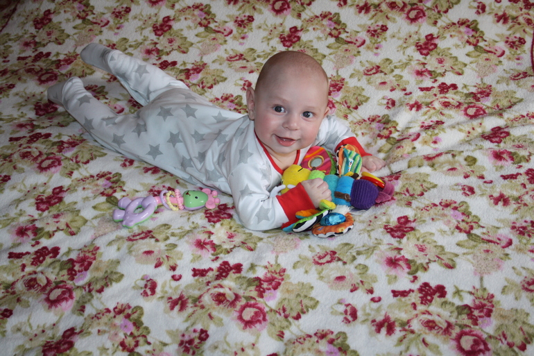 Умелки. В 4,5 мес. перевернулся со спины на живот. Обратно пока нет. Скажем так, новой умелкой пользуется не часто. Очень хочет ползти, пытается, старается, но, ясное дело - тщетно. )