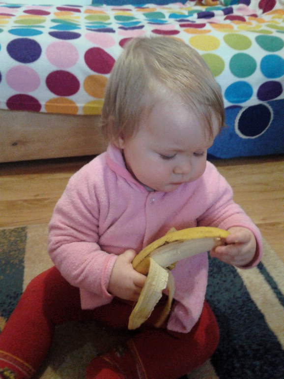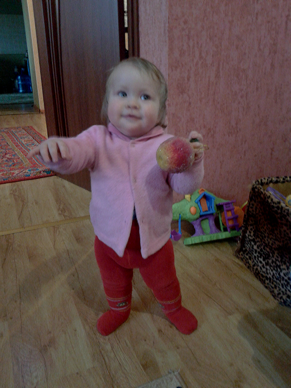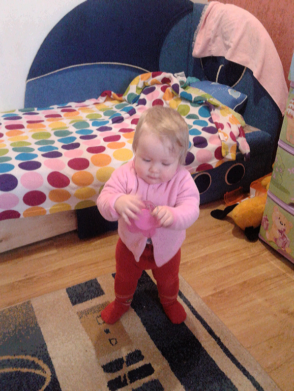 Физическое развитиеРовно 30 марта моя Ника пошла сама уже без поддержки и без полной опоры.Как я уже писала первый шаги она сделала за неделю до 10 месяцев,потом ходила от стула к стулу или еще от какой нибудь опоры.Любила когда ее поставишь посреди комнаты и зовешь ,а она к тебе идет и затем падает в руки.А теперь вот уже 3 дня она сама отходит от дивана и может спокойно пройти пол комнаты,правда по ламинату скользит,но тем не менее едет дальше.Падает правильно ,если вперед то на ручки сразу,а если назад то на попу.В общем думаю к годику побежит.....