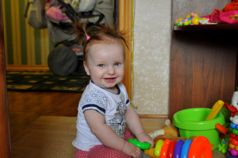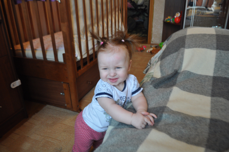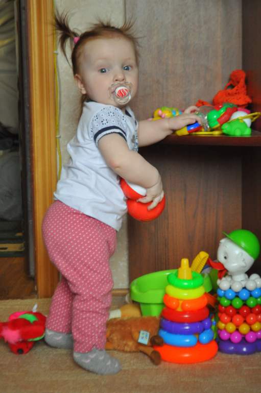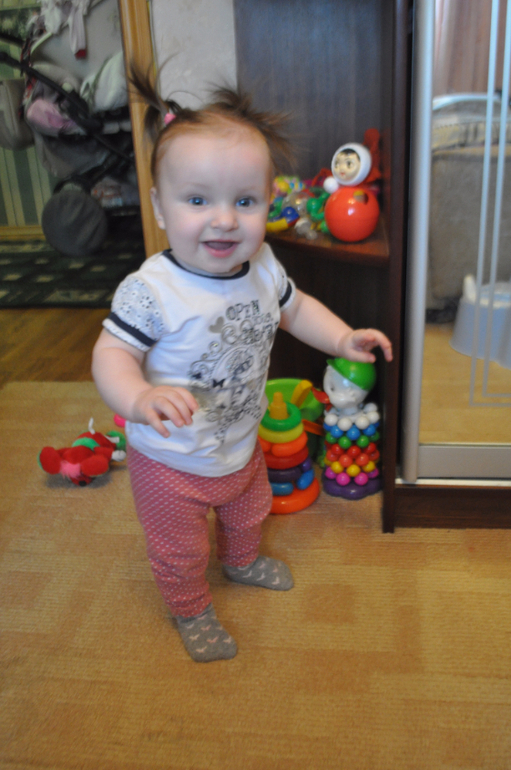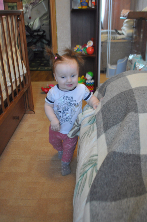 Пытаемся ходить самостоятельно по два шажочка! У опоры чувствуем себя замечательно и бегаем около нее!)