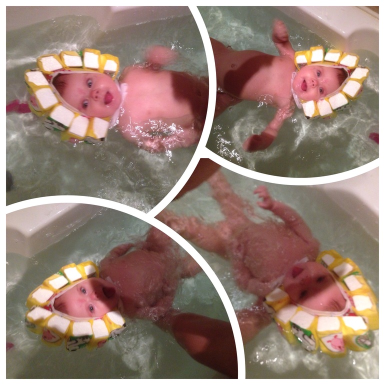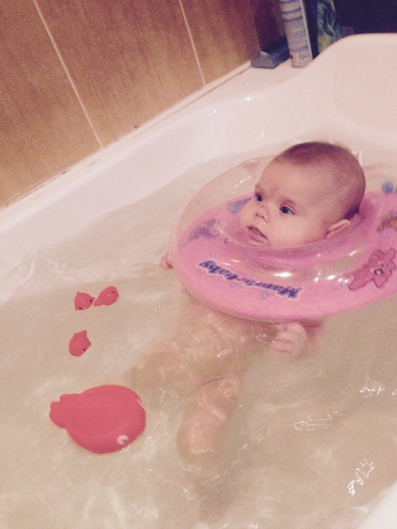 Как итог мы плавали с кругом дома в большой ванне, после того как зажил пупок.
