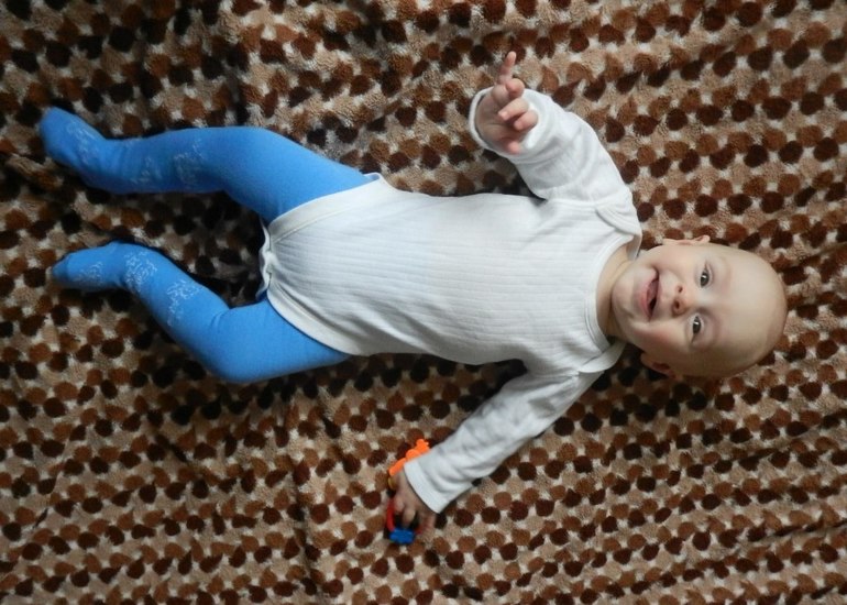 Человек буквально за неделю пополз на животе (помогала ему, подкладывая игрушку так, чтобы мог дотянуться кончиками пальцев - ибо сил хватает, а вот ума, чтобы понять, что делать с руками-ногами, пока не очень)), стал на четвереньки, начал раскачиваться и пытаться ползти уже так. И с четверенек хочет сесть - садится на бок и опирается двумя руками, одну руку убирает, голова перевешивает и падает обратно на спину)