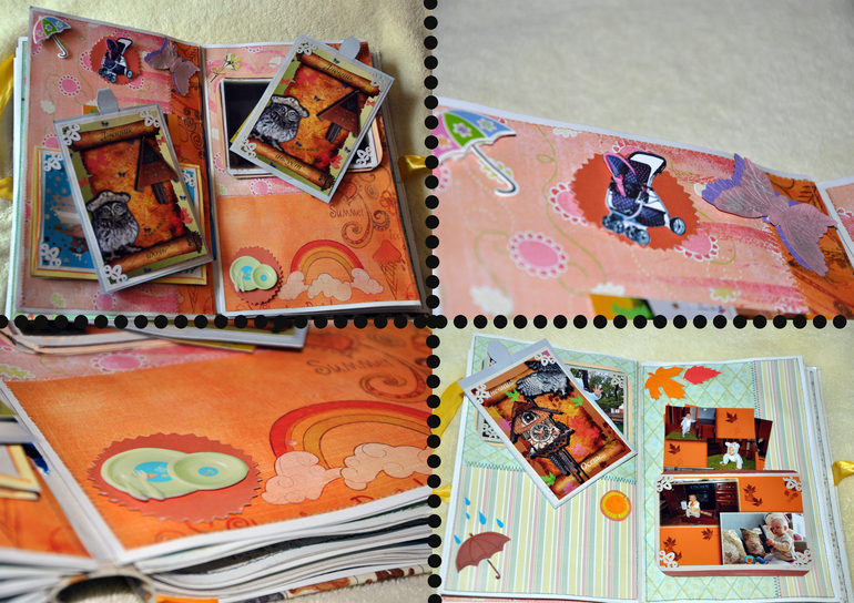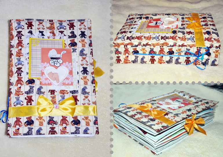 Вынашивая идею альбома, хотелось чего-то особенного: то думала купить готовый альбом, обработать фотки и подписать основное, то задумывалась о скрап-альбоме... Просматривая рекомендации по созданию скрап-альбома и работы других девочек, никак не могла найти того, чего бы мне хотелось... Все не то было: ну да, красиво, куча объемных элементов...Но всего лишь 4-6 страничек и всего лишь максимум на 50 фото(но это уже позиционировалось как запредельное)... Или только фотографии в таком виде: куча всяких элементов и среди них одна-две фото с безликой записью по типу "я родился" или "я первый раз купаюсь".. Хотелось особенного чего-то...А потом вдруг подумала о том, что хотелось бы и записи основательно оформить и совместить их с фотками. Делать нечего-пришлось создавать альбом в стиле скрапа, чтоб вместить все то,что бы хотелось-записи, фотографии, ну и сделать его веселым, малышовым и уникальным.