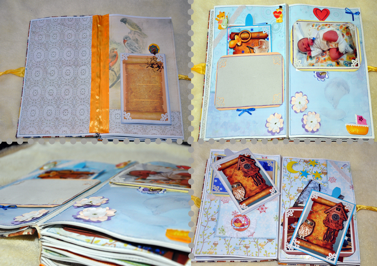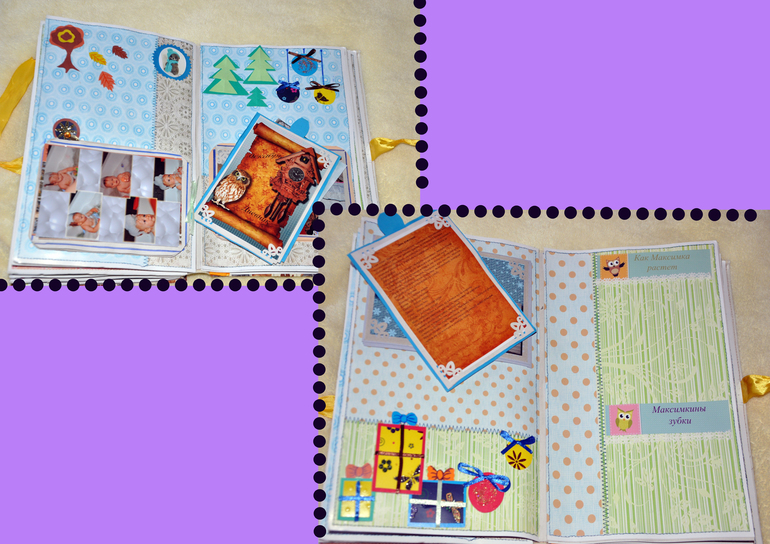 На первой страничке сделала вставку на три разворота со значением имени сына, гороскопом для его знака и что связано с датой рождения( а связано очень много, ибо это был "конец света"-21.12.12). Следующая страничка посвящалась моей беременности, ну а далее по месяцам фото и дневник развития и событий на обороте вкладочек. Вкладыши конечно же с совой! Совушки-это первое во что влюбился сын. Второе-машинки, но эта зависимость совсем другая история.