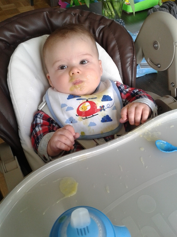 Неделю кушаем прикорм, уже ввела кабачок, цв.капусту и морковь. Цв. капуста не пошла, его рвет от ее, попробую ее дать не в пюрированном виде, а кусочком (вчера в консультации посоветовали). Вчера так смотрел на мой банан и тянул ручки, что дала облизать, сегодня в ниблере дала. Вообще, в консультации сказали, что можно по 2 продукта в 1 день вводить, только на разные кормления и потом несколько дней давать, чтобы привыкал.
