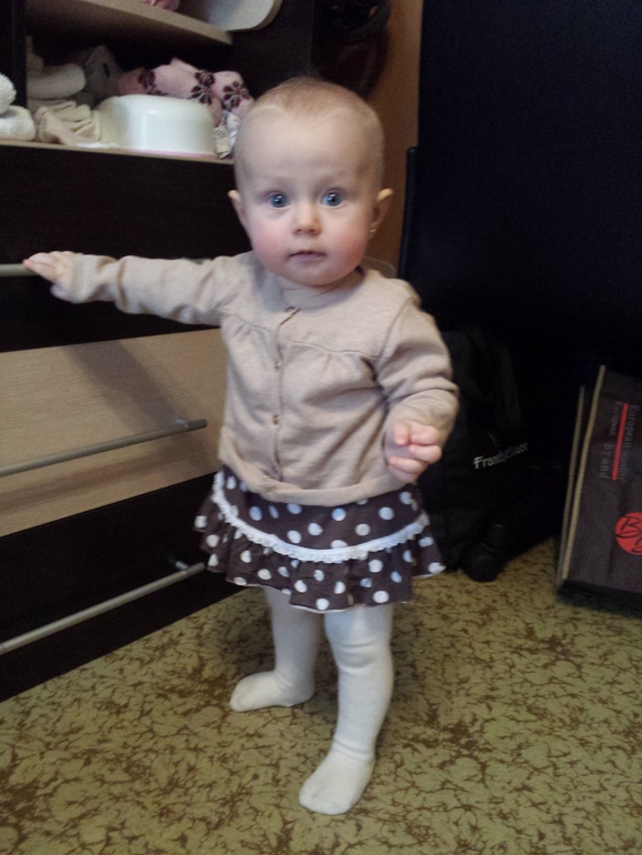 За этот месяц Лизка еще больше повзрослела и стала еще смышленее. Ладушки (особенно хорошо на головку сели получается),пирамидку разбирает и пытается собрать,если сосредоточится,то пару раз получается одеть колечко,а так координация еще не особо позволяет,знает лялю и гладит (больше скребет ногтями) какая ляля хорошая, что то говорит с разными интонациями на своём тарабарском и частенько нам устраивает целые монологи,смешно до невозможности,главное так серьезно это делает! Очень любит,когда приезжает бабушка (моя мама),она бывает у нас 1-2 раза в неделю,привозит подарки и новые наряды,а главное играет с Лизкой,остается с ней,когда я хожу в зал. Папу с работы встречаем с визжанием и хлопаньем в ладоши)))) но мамин хвостик, ну наверно это естественно.