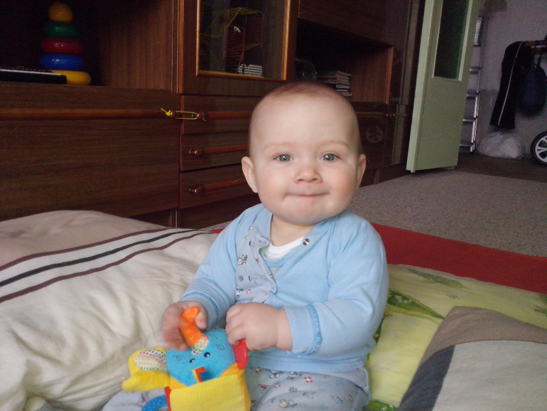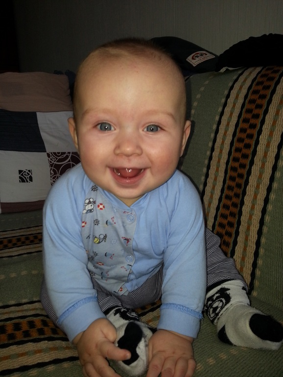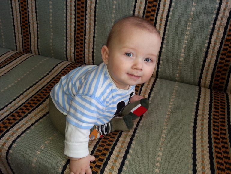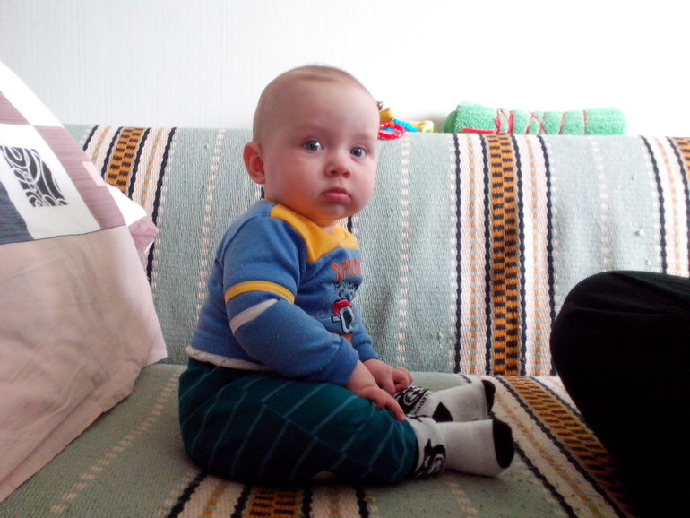 Сына научился сидеть самостоятельно. Вернее, мы научили, потому как садиться он еще не умеет сам, хоть очень старается. Сажу его на пол, обкладываю подушками и больше не придерживаю, чтоб он учился равновесие держать. Пару дней как научился подставлять руки, чтоб на спину не упасть, а раньше просто падал на подушку и сразу ныть начинал. А еще научился из положения сидя на четвереньки вставать, так что глаз да глаз теперь за ним нужен.