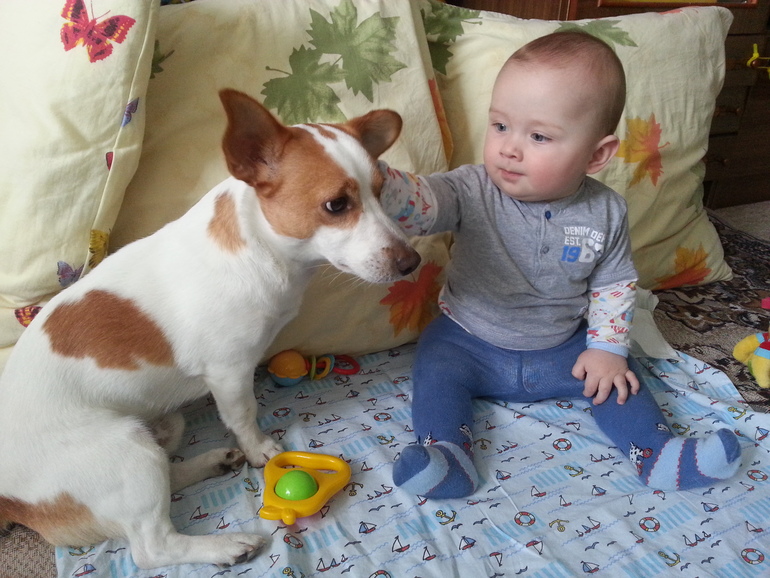 В последние дни наш пес как-то очень сильно проникся к Ярославу обожанием - ходит везде за ним, крутится под ногами когда его несешь, вылизывать пытается и все свои вкусняшки ему отдает, уже замучилась отбирать. Как-то кость свою жевательную подсунул, так я ее изо рта у Ярика практически забрала. Так и живем - пес подсовывает, я убираю.