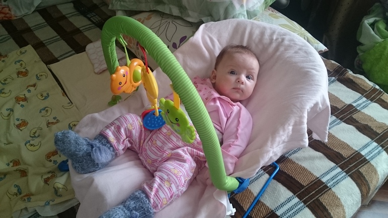 Лучше всего мы умеем чмокаем кулачки, слюни от этого текут рекой, а если попробовать убрать, то можно на протестующих крик напросился, так,что разрешаем чмокать. Еще смотрим на погремушки, но не трогаем- опасается. Улыбаемся всем, своей очаровательной, беззубой улыбкой. Показываем язык и крутим фигушки- это заслуга старшей дочери научила. Гулим и агукаем в основном с бабушкой, видимо на родителей жалуется. Не пеленаемся уже две недели, чему дочь безумно рада и в благодарность теперь засыпает сама в кроватке под мобиль. Хотя бабушка считает, что это мы ее замучили своей любовью и качанием на руках. Оправдывая свое имя Варя очень любопытная девочка любит когда по квартире носят при этом голова на все 360 градусов крутится- вдруг что пропустит.