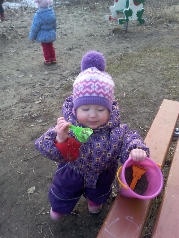 Тут Ксюше уже год, это мы на прогулке во дворе. В ботинках ходит она не очень хорошо,поэтому за скамейку держится. Ещё мы умеем показывать пальчиком животных,умеет собирать пирамидку и кубики. Умеет сама подавать то,что попросишь из игрушек. Педиатр наша довольна. А мне кажется,что все дети этому научатся,кто раньше,ну а кто позднее.