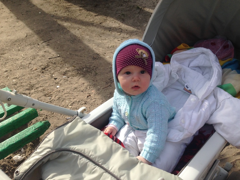Сидит Златка с 5 месяцев. Эпизодически, и я стараюсь отвлекать. Первый раз села и удержалась руками в стульчике для кормления, потянулась к игрушке на столе. Это было в канун пятимесячья. Потом через недельку повторила номер в коляске, опираясь на локоток сбоку (фото прилагается). С тех пор периодически удивляет мамочек на площадке своим сидением. Как бы я ни старалась ее уложить обратно, она проворно садится снова. Я понимаю, что это еще не полноценная посадка, т.к. и у стульчика и у коляски угол спинки 30-45 градусов, да и удержаться сидя она пока не может спиной, только опираясь руками. Так что и я пока не поощряю её попыток, пусть подольше поползает и прокачает спинку))))