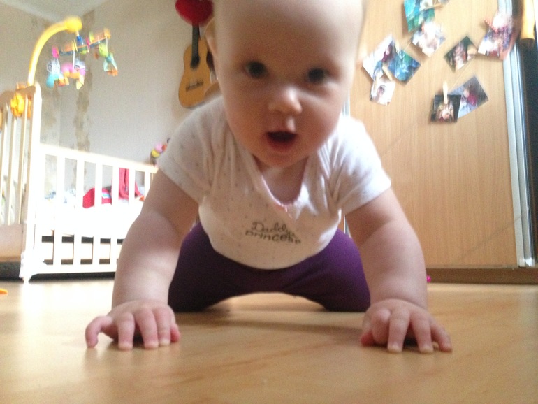 Поползновения. В 5 месяцев 12 дней она вдруг взяла и по ползла к погремушке. Внезапно, в один день, сразу быстро и далеко. Вечером этого дня уже ловила её в коридоре! Сначала это было как у кузнечика: встает на прямые руки, отталкивается пальчиками ног и перекатываться вперед черпая носом. Через недельку начала становиться на четвереньки и качаться. Потом с четверенек бросок вперёд. Пока полноценно на четвереньках не бегает, но чувствую, что уже на днях.