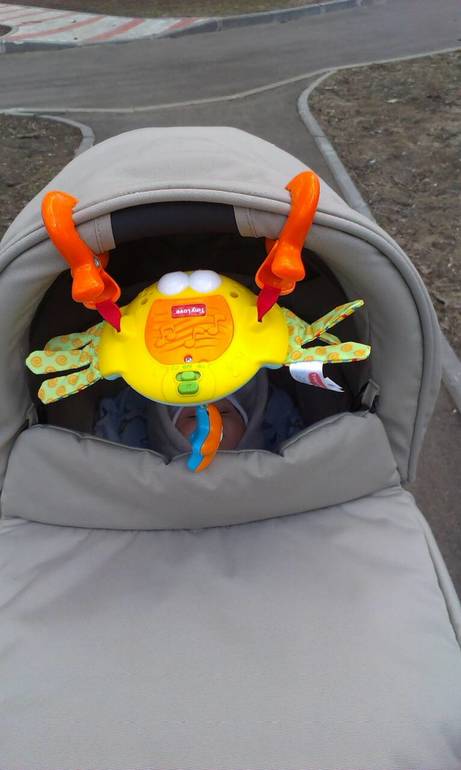 У нам такой же крабик...мы на него не особо ещё реагируем....а что кстати вы впервые на улицу вышли??? Мы давно ходим погода такая же как и а москве..вчера с пол 3 дня и до 7 вечера она гуляла...хотя в 5 я её забрала домой покормила и обратно вытащила...любит улицу и всегда спит...я иногда это первые прогулки боялась начнёт орать и заранее сцеживалась и к ней ложила...я боялась проснется и орать будет но всегда не было необходимости....