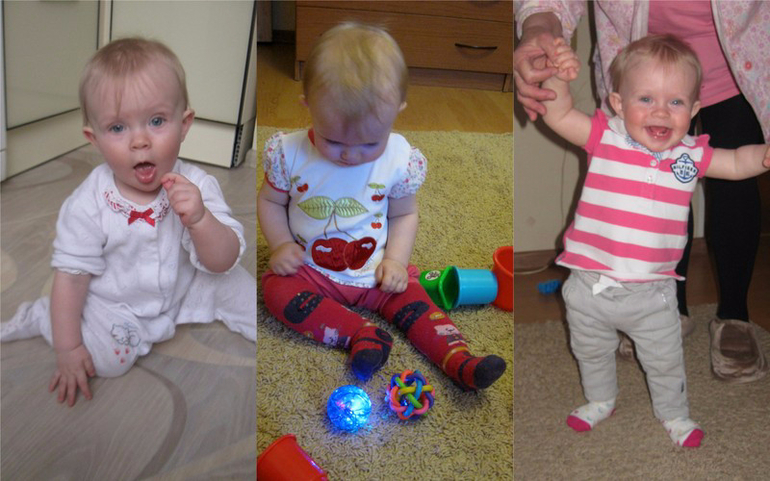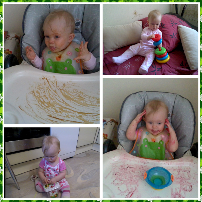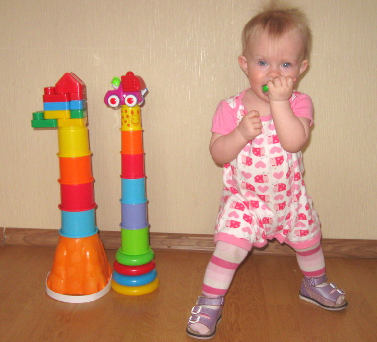 Любит вещи свои перебирать и проверять все ли на месте,возьмет одну и начинает на ногу одевать .На горшке тоже обязательно сидит и старается обратно одеть памперс или колготки,деловая очень! Бабушка приехала,все пыталась на руках ее таскать и на диване держать,холодно ведь на полу,Варя на третий день не выдержала,стала от бабы прятаться)) Начали ходить за одну ручку и подолгу стоять без опоры!