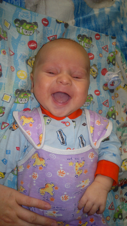 Разговаривает сын постоянно, с перерывами покушать и покричать чтобы взяли на руки и поносили по квартире! Как насмотрится опять ложиться разговаривать)) Улыбается и агукает, причем повторяет все что я ему говорю в плане "агууу"...Когда требует кушать кричит "маааааа")))