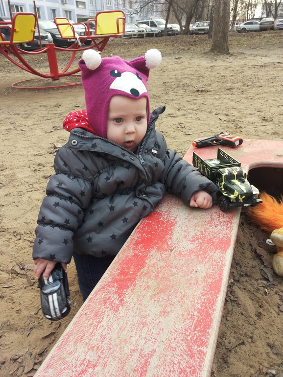 Дочке скоро годик поэтому и мы стали гулять не на сон, а на "погулять". Ей безумно всё интересно на площадке, и детки, и их игрушки, и качельки, и песочница. Фоточки: