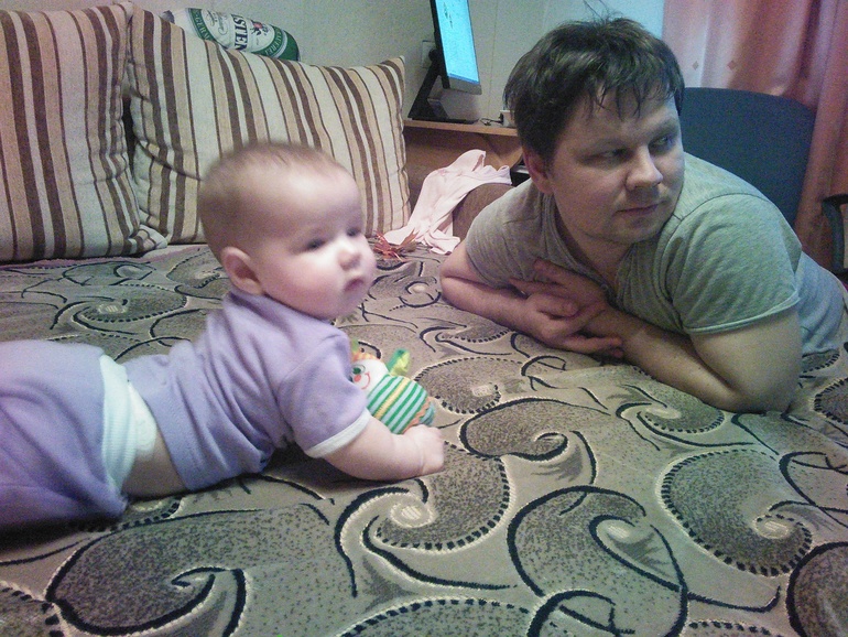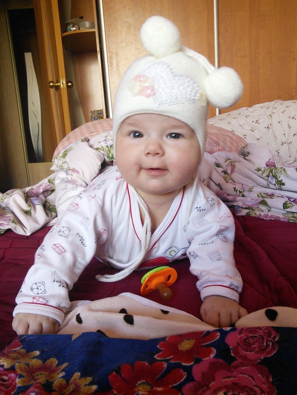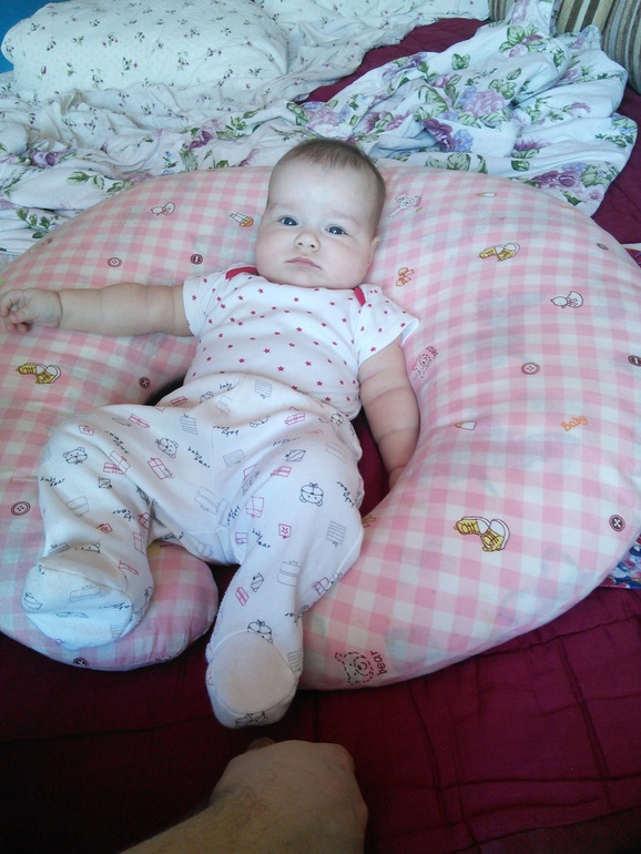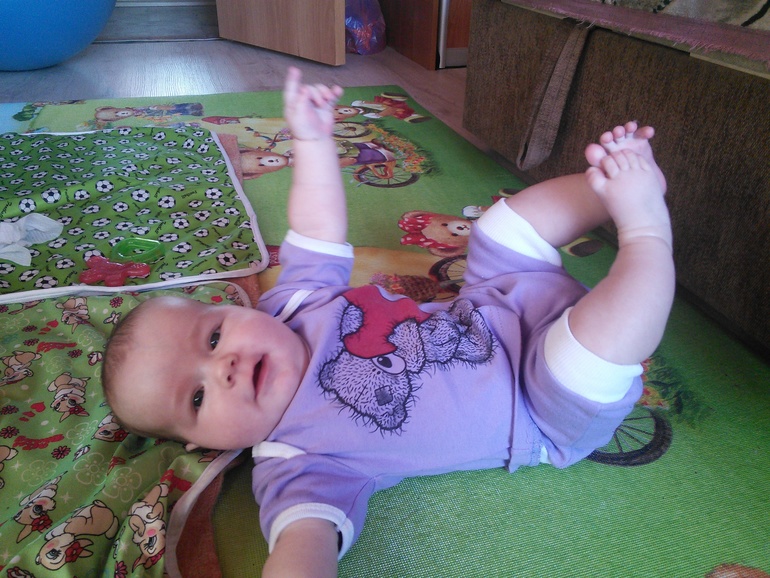 Что умеет моя принцесса? Так сразу всего и не упомнишь. Переворачивается на живот через оба бока. С живота на спину редко. Пытается передвигаться разными способами: на спине, отталкиваясь ногами, на животе, высоко поднимая попу и вставая на ножки, перекатываясь. Получается с переменным успехом.