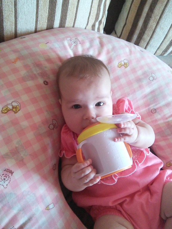 Сама держит бутылочку с чаем, а вчера пила из поильника.