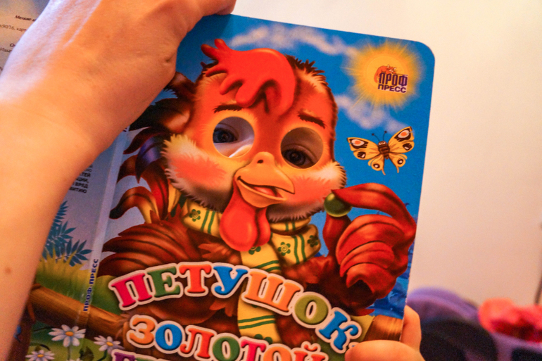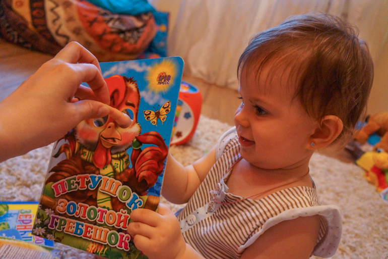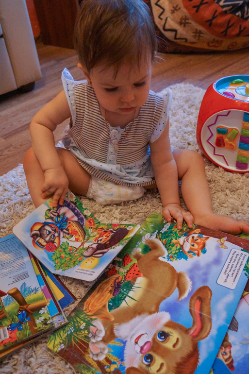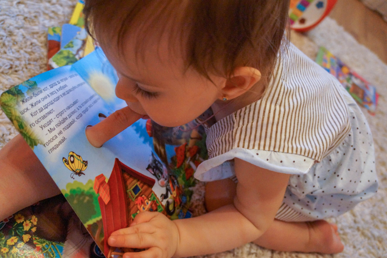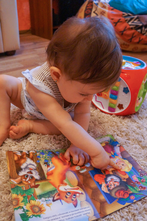Очень любит читать. У нас гора картонок, она выбирает понравившуюся, протягивает мне, я ей читаю. Потом дает мне следующую. И так может продолжаться до бесконечности, минут 40-час. Я эти книги уже видеть не могу, если честно)) Знает и показывает на картинках очень много чего.