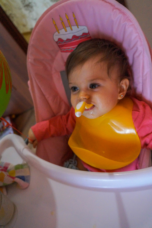 Наконец-то более-менее наладился режим ночных кормлений. Теперь кушает смесь Марьяша в 20.00 210 мл и в 3.00 180 мл. Потом уже в 9 утра у нас каша. Днем ест плохо, в стульчике все также сидеть не хочет. От груди дочка отказалась полностью. Но любит целовать тити, утыкаться в них лицом и так долго лежит кайфует))