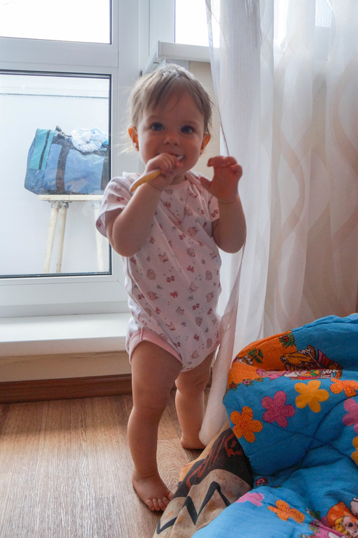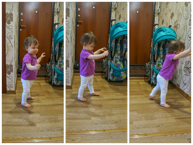 Ходить Марьяша так и не начала, но старается очень. Пару-тройку шагов делает легко. Ползать почти перестала. везде ходит вдоль стен.
