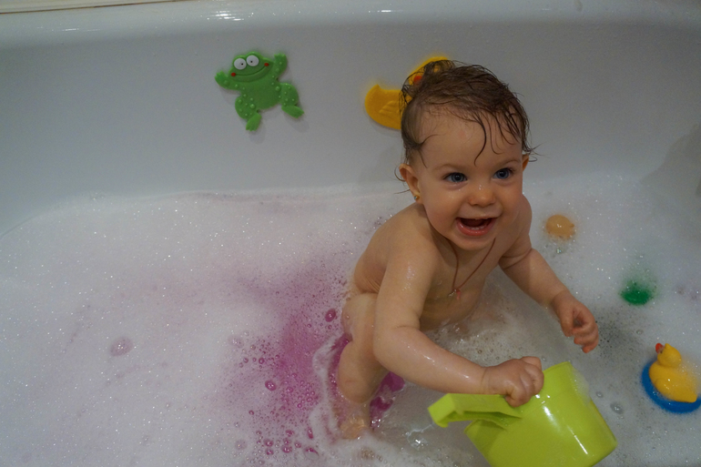 Поэкспериментировали с детской пеной. Первый раз Марьяше понравилось, а во второй она решила пену есть, так что решили отказаться от такого купания пока.