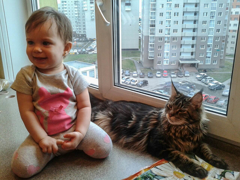 В гостях у друзей красавица кошка мейн кун и шикарный огромный подоконник: