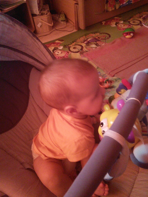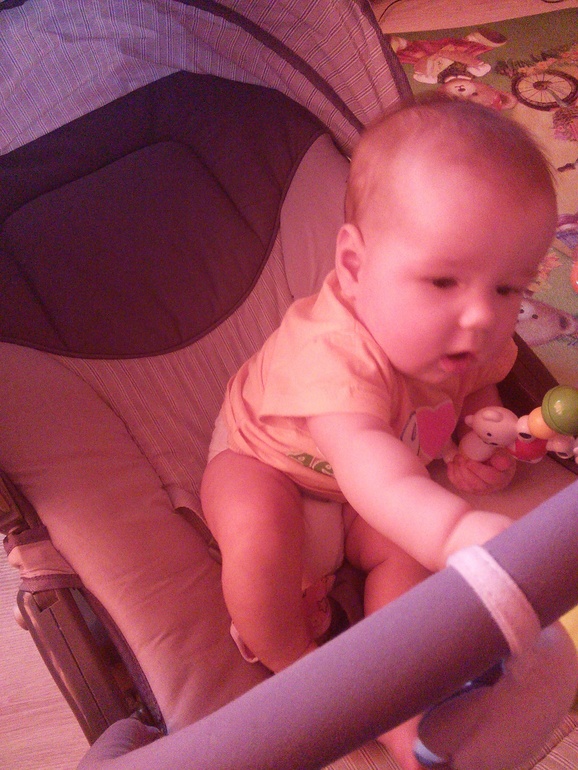 . Это конечно за сидение не считается, т.к. садится из полулежа или хватаясь за опору. К вечеру стала вставать, хватаясь обеими руками за мои пальцы. Сначала подтягивается и садится, а потом отталкивается ногами и встаёт.