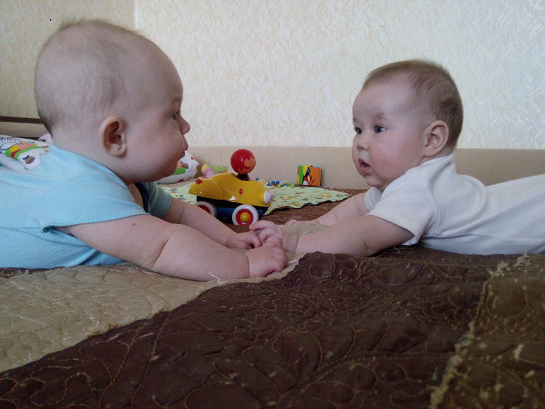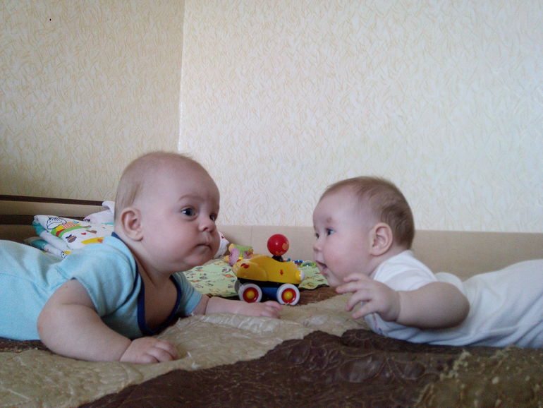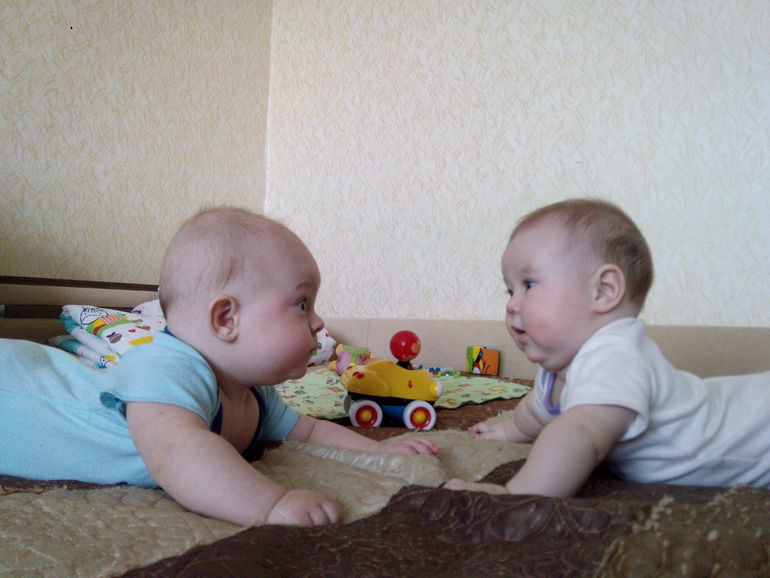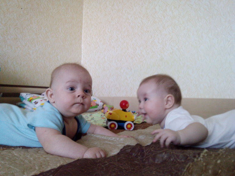 Все дети хоть и похожи,но такие разные:) Ромыч умеет переворачиваться с живота на спину,Олеся нет. Зато Олеся сутками стоит на вытянутых ручках,а Ромыч-рееедко рееедко,и недолго. Ромыч прыгает,если его поставить на ножки,а Олеся шагает:) Ромыч ест гораздо чаще. И мне кажется,он капризнее:) Ромыч сосет соску,Олеся нет. Ромыч плохо гуляет в коляске,Олеся норм (ттт). Но они оба шилопопы и это очень классно;)