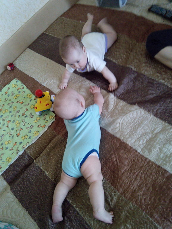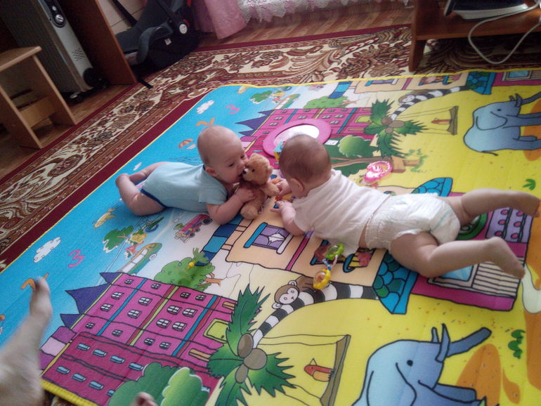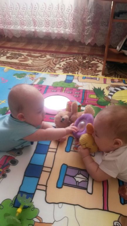 Потом они дрались за игрушки на коврике,а мамы снимали и ухахатывались: