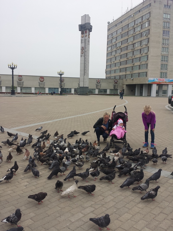 Как я уже писала,погодка там нам немного подпортила каникулы,но к 9 мая начала налаживаться,мы сходили на парад,Лиза была в радостном возбуждении,видимо от количества народа и солнечного дня (наконец!!!). Мы смогли посмотреть небольшую часть шествия солдат и митинга. Всё прошло красочно,солнечно. Потом мы пошли на набережную Амура,где Лизка выспалась,а мы с друзьями перекусили в кафешке. Потом решила показать своему детю голубей. Там они какието бесстрашные и немного сумасшедшие))))решила я привлечь их внимание печенками,бросила на площадь горсточку и тут вся стая (штук 200) резко полетела на нас