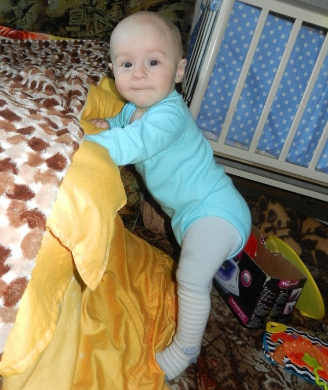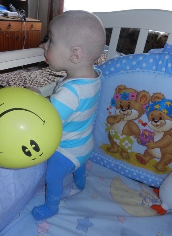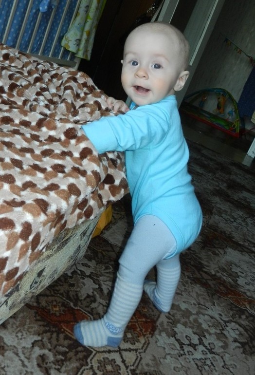 15 мая мой сынулька стал вставать у опоры, и теперь делает это регулярно, особенно там, где встать тяжело или нельзя (типа холодильника), и даже пытается отпускать одну руку. И стоит довольно долго! И это всё за пару дней!!!