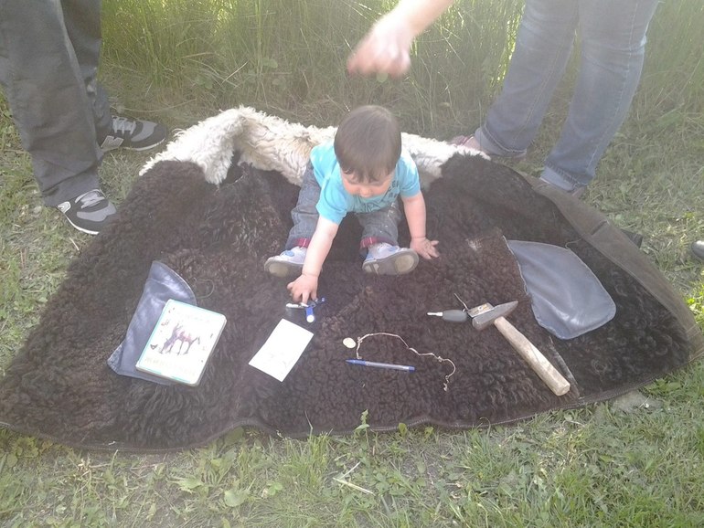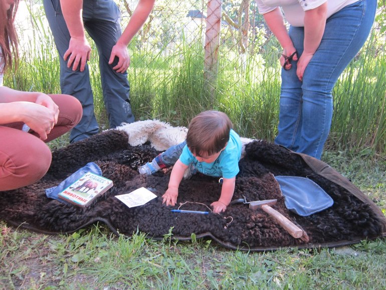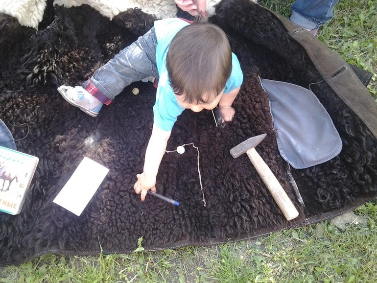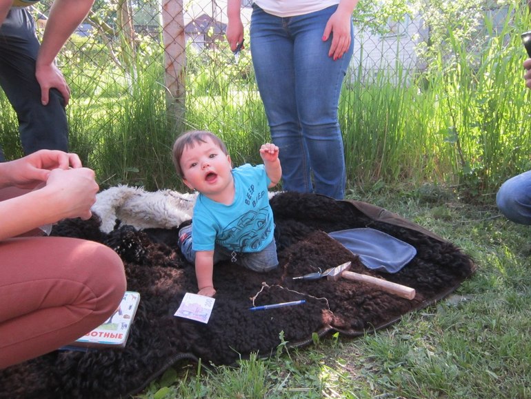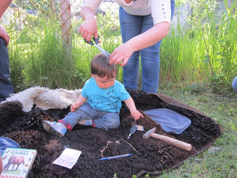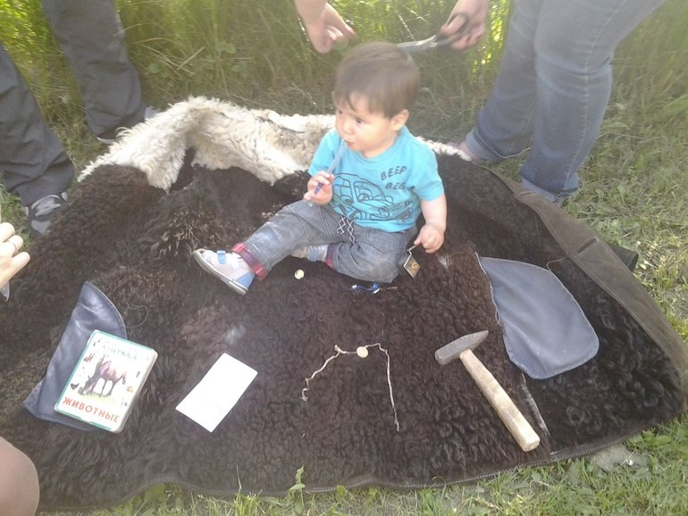 садили Севку на шубу)Взял: ключи от квартиры,потом от машины,потом взял в одну руку мелочь(50,25 коп.),а в другую ручку).Ложили еще ему книжку,золото,крупные деньги,молоток.Сыночек сделал свой выбор.Кумовья состригли крест накрест волосики(храню).