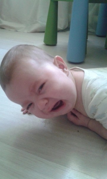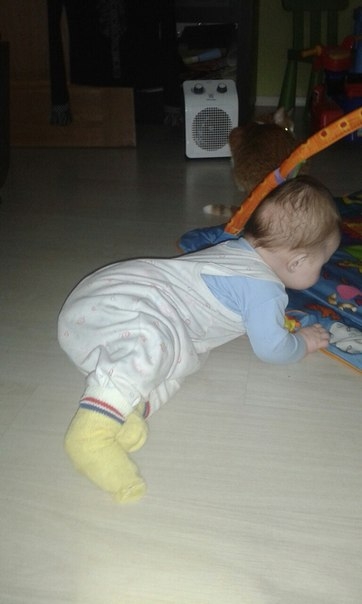пытается ползти,а потом на бок,как бы сесть хочет,опираясь на локоть лежит как котик на бережку))а второй рукой об пол стучит как бы требует ))